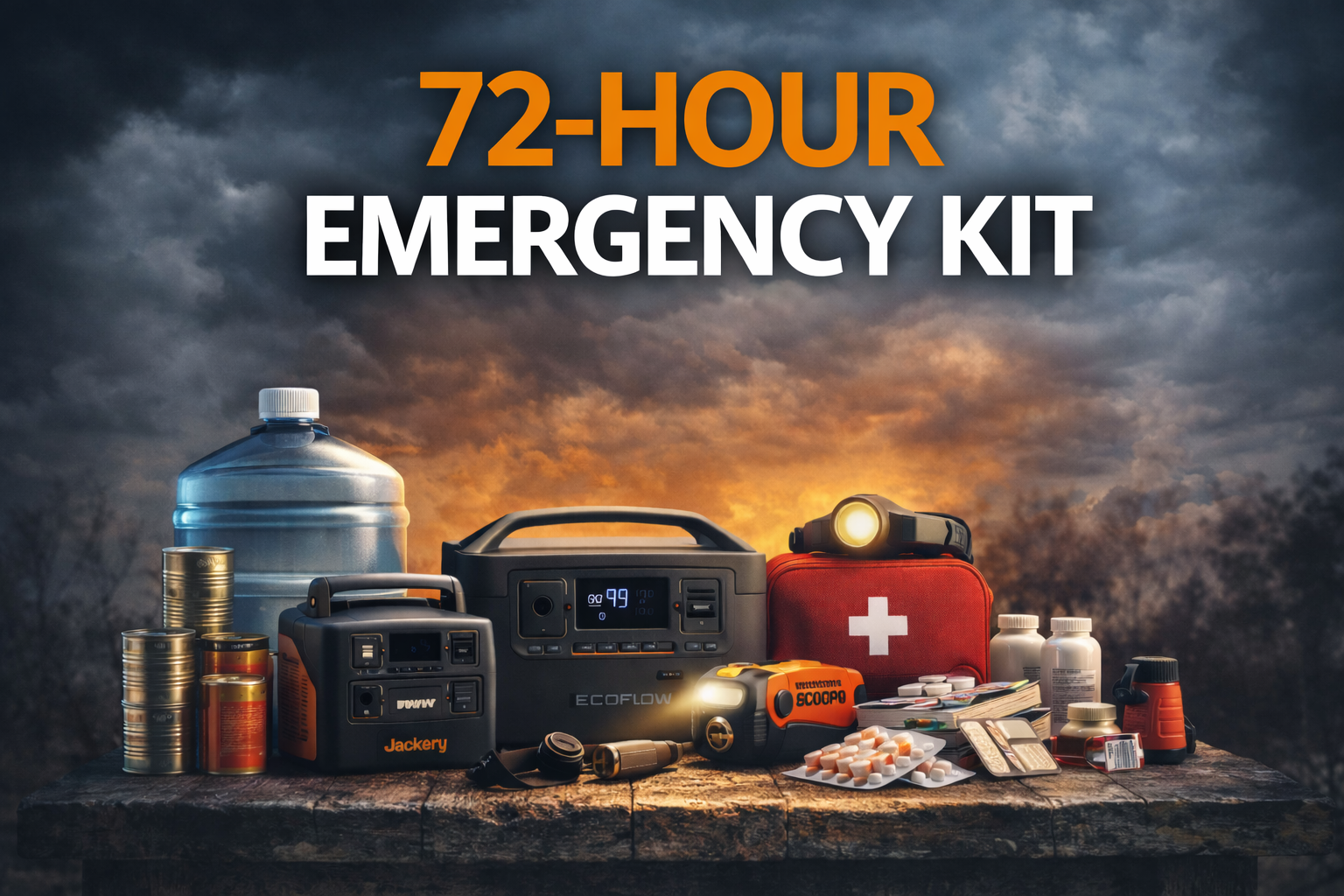 Start with water storage, then headlamp, power bank, and an emergency radio. Those four items solve the biggest problems in most urban outages.